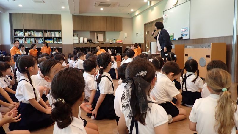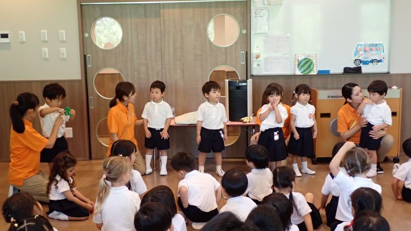 真っ黒に日焼けした子や、少し背が伸びて大きくなった子、中には、久しぶりの登園に不安で、泣いてしまっているお子さんも見受けられましたが、教室に入り友達や担任と顔を合わせ、ホッとしたのか、いつの間にか笑顔になっていました。どのクラスからも、「海に行ったんだよ」「お泊りしたの」と、この夏に経験した話やサマーチャレンジで頑張ったことを発表したりと、楽しい会話で盛り上がっていました。