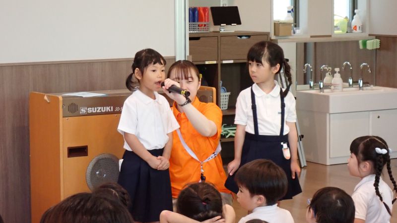 話は尽きない様子でしたが…全園児、職員揃っての始業式が始まりました。9月より新しく仲間になったお子さんの紹介では、前に立ち緊張しながらも自分の名前を伝えることが出来て立派でした!