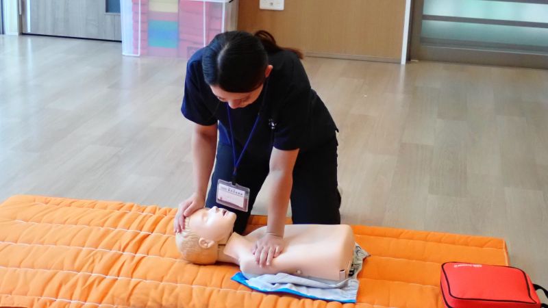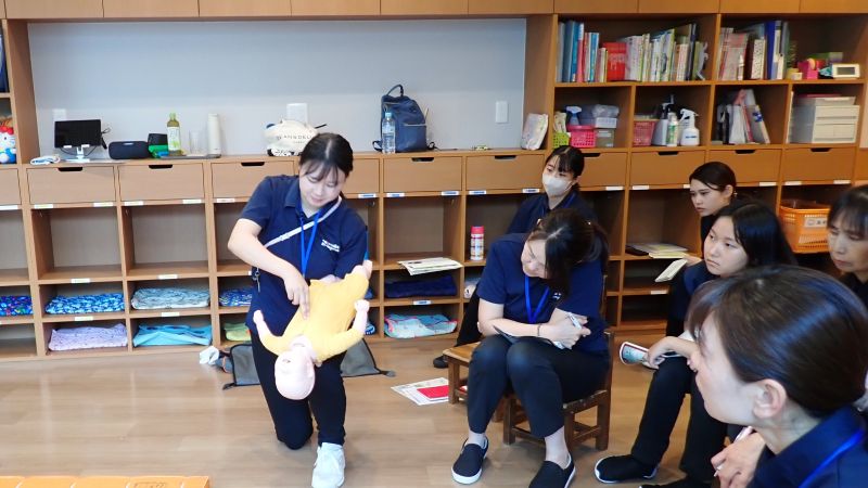 1つは、救急講習です。消防署にお勤めで普段から救急の講習をご指導いただいている講師をお招きして、職員全員人工呼吸のやり方やAEDの実践訓練、窒息対処法など様々な場面を想定して、教えて頂きました。実際にはあってはならないことではありますが、私たち職員の知識のひとつとして学ばせて頂き勉強になりました。