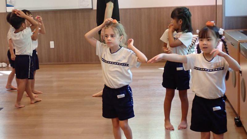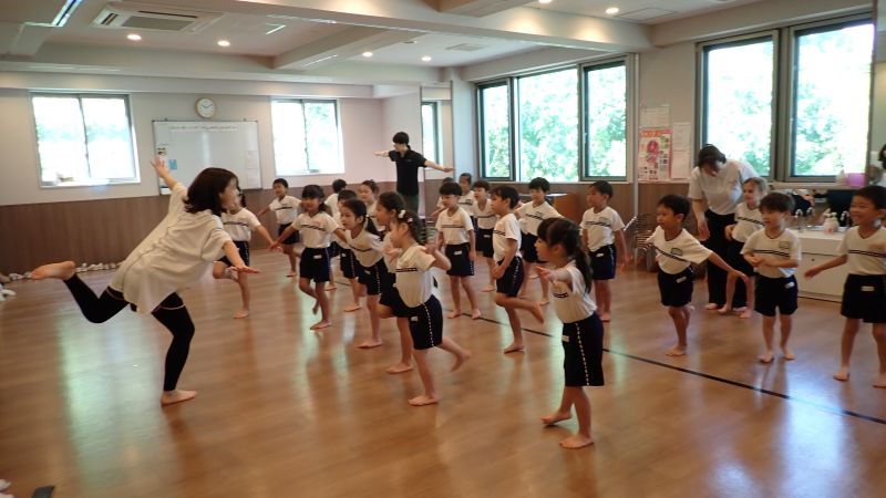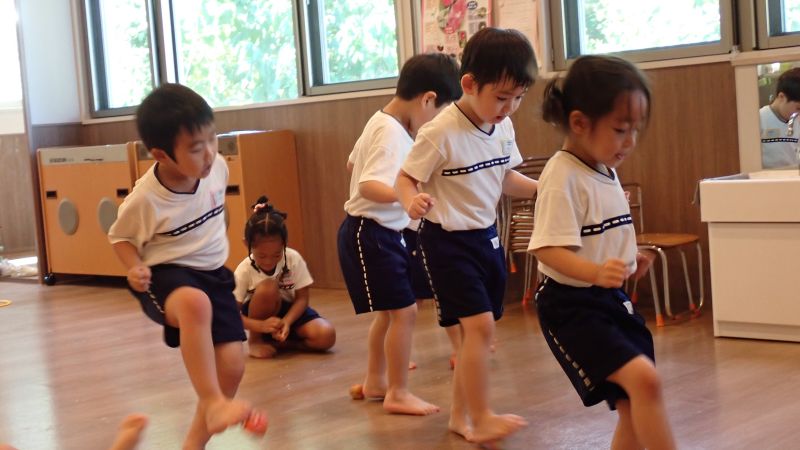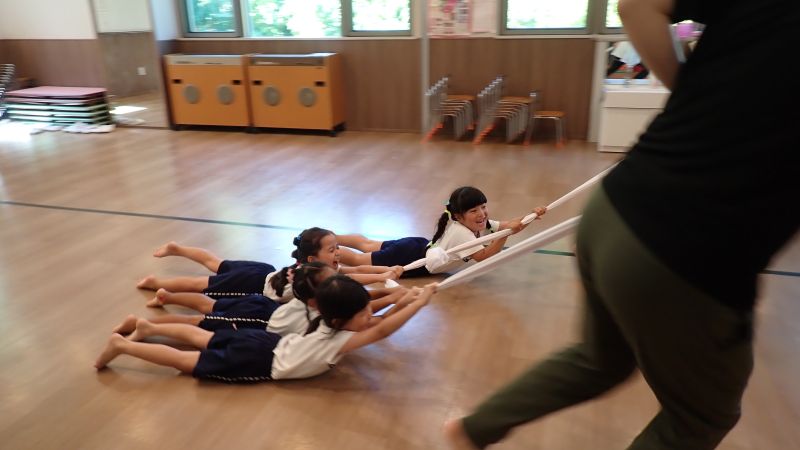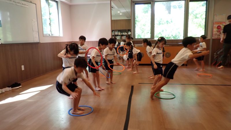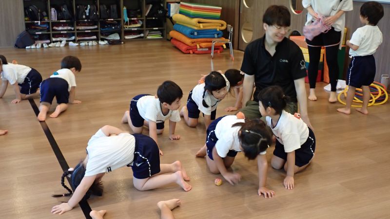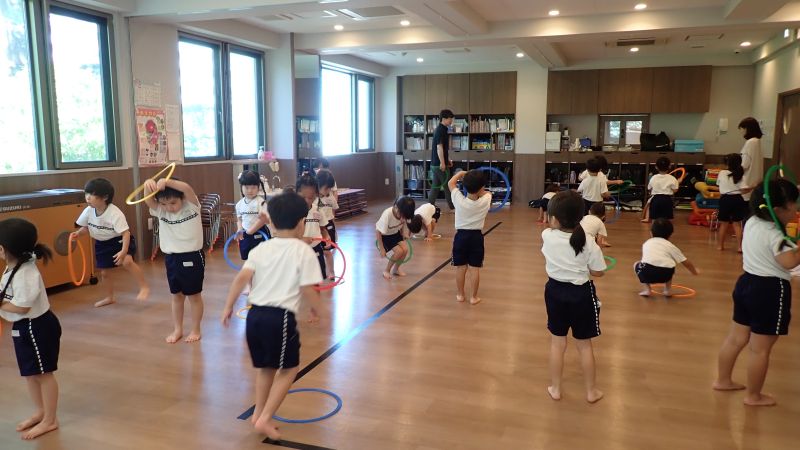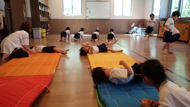 子供たちに取っては無理なく体を使って楽しむ活動で、お手玉を背中に乗せて動いたり、足の指で掴んだり、マットの上を転がって、リングを潜ったり全身を使って行う活動を、どの子も笑顔いっぱいで楽しむ姿がありました。最近は、暑さの為戸外で思い切り体を動かすこともできない中、部屋の中でも思い切り動く活動は、子供たちにとっても魅力的です!