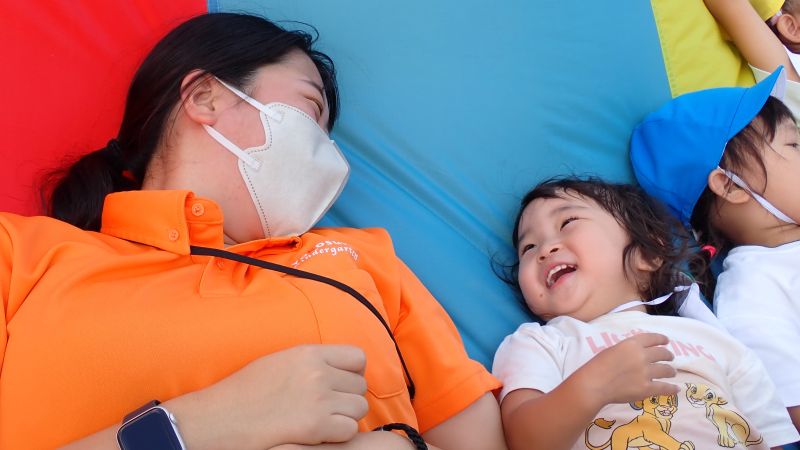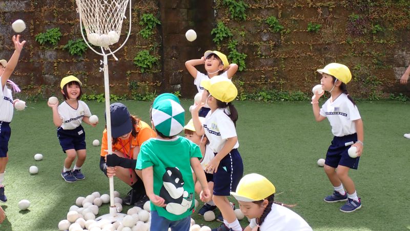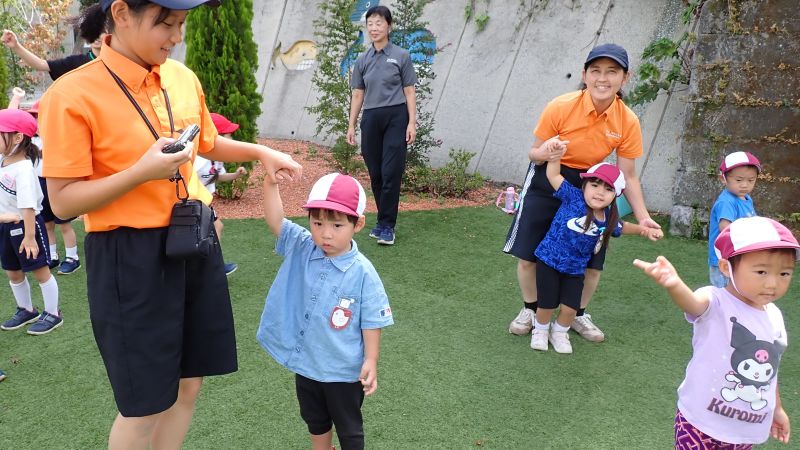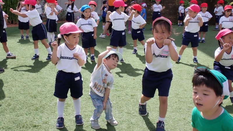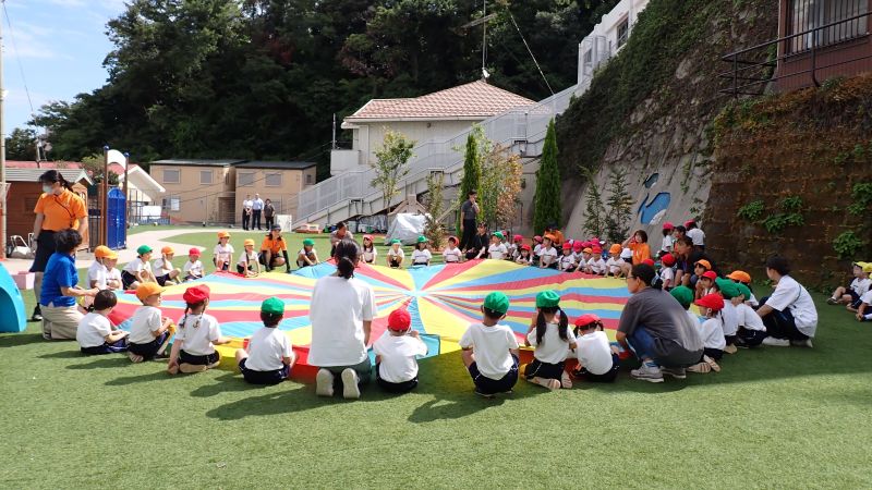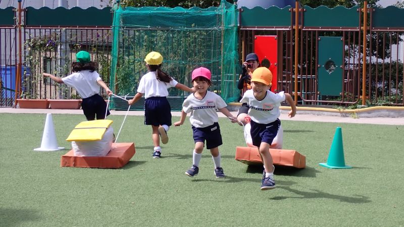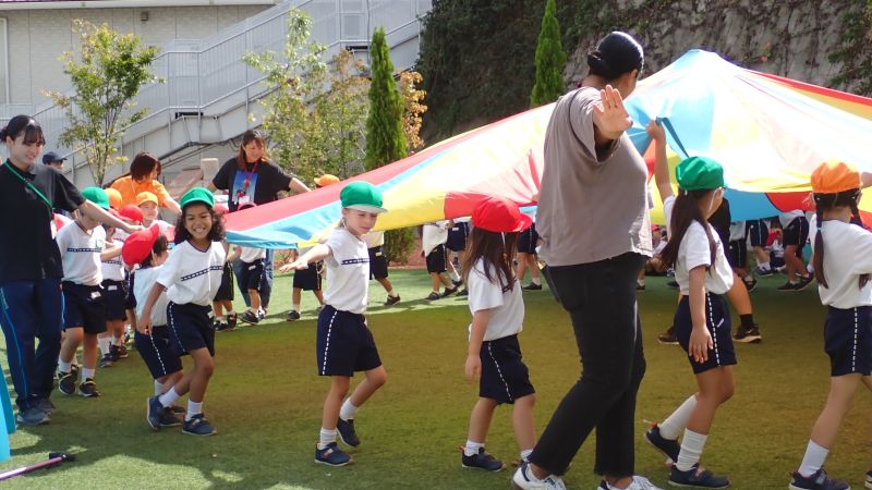 まずは、玉入れから始まります!乳児クラスのふたば組や2歳児のにこにこ教室のお子様もお兄さんお姉さんの真似をして、一生懸命籠に玉を入れていきます。沢山入った方が勝ちということも理解できていました。見よう見まねで行うことでも、同じ経験をすることでの学びは大きいものです。また、年少・中・長の子供たちは、小さい子にダンスややり方を教える姿があったり「頑張れ‼○○ちゃん」と応援してあげていたり、小さい子を思いやる姿が見られ、嬉しく思いました。お互いに刺激を受け、成長が感じられるひと時となりました。教室では、年長組の行った組立体操をかっこよく思えたようで、年中組の教室では「扇!」と言いながら三人で扇の演技を真似する姿も見られ、来年度自分達が行う姿を想像し、憧れと期待に繋がったようです。どの学年も行事を通して、良い刺激を受け、成長に繋がっています。次の行事では、どんな姿が見られるのか楽しみです。