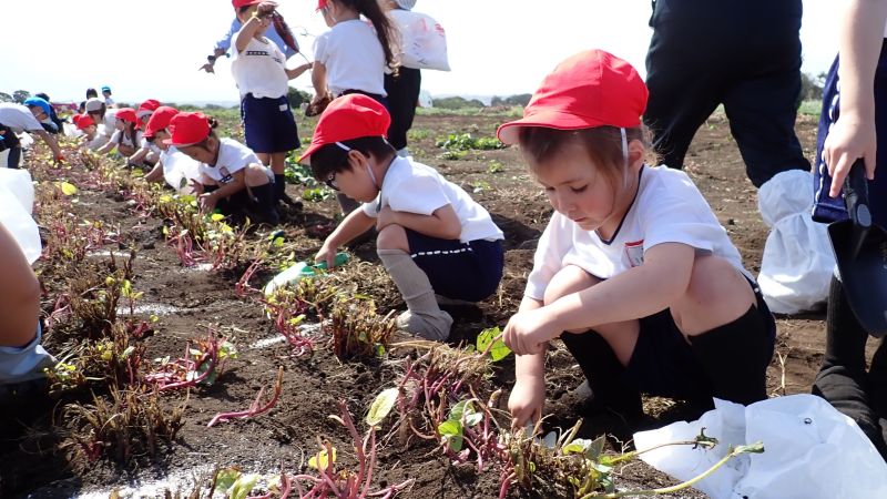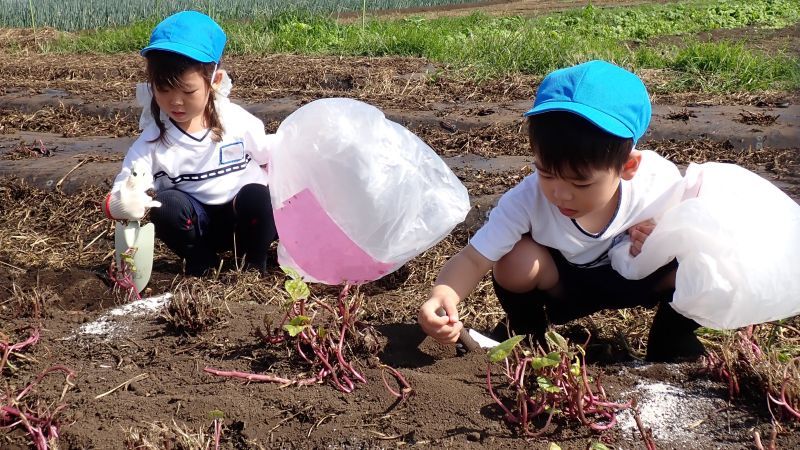 お芋が傷つかない様に丁寧に掘り進める姿は流石年長組です。畑のあちらこちらからは「掘ったよ」「見て!大きいよ」と広大な畑の中で賑やかな声が響いていました。