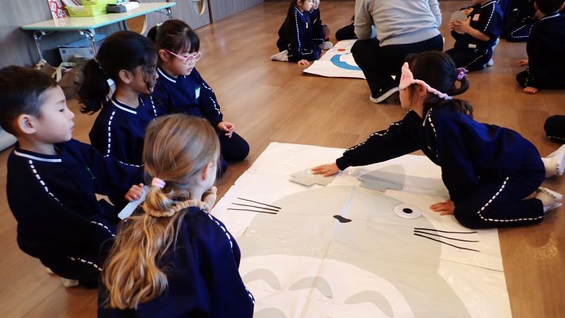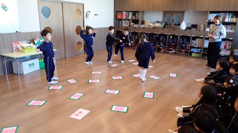 まずは福笑い。星組は、「もう少し右!左!」と的確に指示が飛び、まるで見えているのではないかと思うほどの出来栄え(笑)おひさま組はというと、「ン~右かなぁ?左!」と様々な意見が飛び交い、指示の仕方もクラスの個性が出ていました。すごろくでは、止まったところに書いてある指示に従います。 「お尻をフリフリする」「うたを歌う」などのマスでは、可愛いフリフリダンスやお遊戯会で歌った