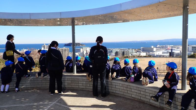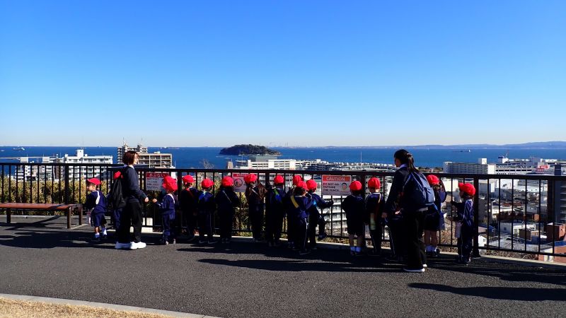 一番高い場所に上がってみると、いつも目にしているものの猿島や船を見ると、「すごーい」「海だぁ」と横須賀の景色に目を輝かせていました。本日は、温かく天気も良かったので、本当にきれいな横須賀の街や海を見ることが出来ました。