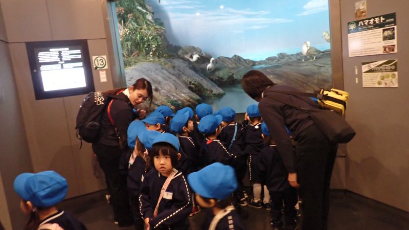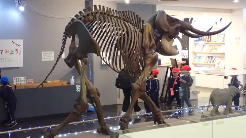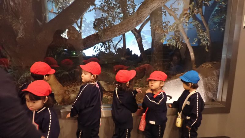 また、隣接する横須賀市自然・人文博物館の見学もさせて頂きました。中に入ると、すぐに大きな「ナウマンゾウ」の化石が展示されています。この化石は、現在の米軍横須賀基地内である横須賀製鉄所から1867年に発見されたそうです。床には大きなナウマンゾウの足跡があり、「大きいね」と自分の足と比べたりと興味津々です。三浦半島の森林や海岸のジオラマがあり、キツネやフクロウ、冬眠しているカエルなど森林の中での生活を見ることが出来ます。全部は見る事が出来ませんでしたが、是非ご家族でまた出かけてみてはいかがでしょうか?