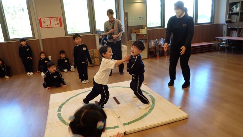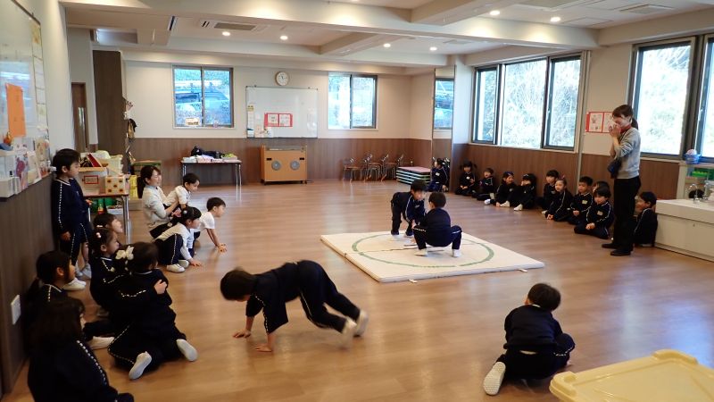 さて、結果は…たんぽぽ組の優勝!この後も、独楽回しやだるま落とし、羽根つき等の正月遊びで勝負が続いているようですよ。