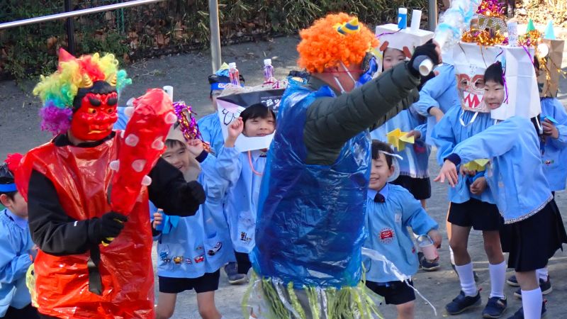 「鬼はそと!福はうち!」と張り切って豆を撒く子もいれば、迫力あまりに大粒の涙が溢れ教諭の周りや後ろに隠れる子なども・・・