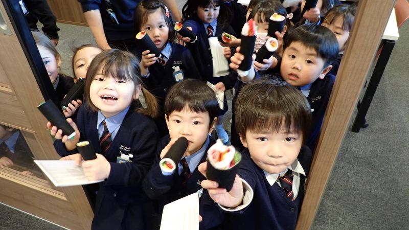 一方年少組の子ども達の手作り『恵方巻』が職員室へも届き食べさせてくれました♪