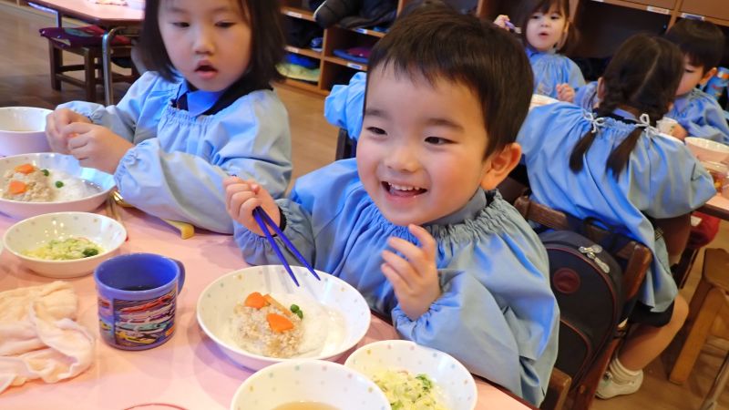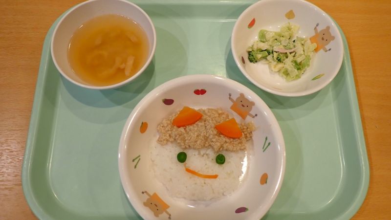 本日の給食も可愛らしい『鬼のそぼろご飯』。年長/中組は鬼の角や目などは自分たちで飾りつけ、美味しくいただきました。