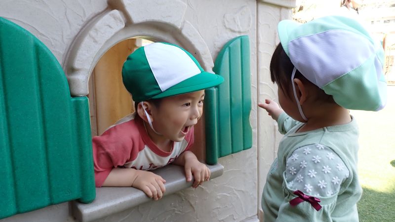 一方、進級した2歳児は、初めて対面する1歳児の姿に少し圧倒され、不安そうな様子も見られましたが、時間の経過と共に玩具を貸してあげたり、優しく声を掛けたりする姿が見られました。さすが頼もしいお兄さん・お姉さんですね。