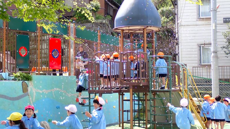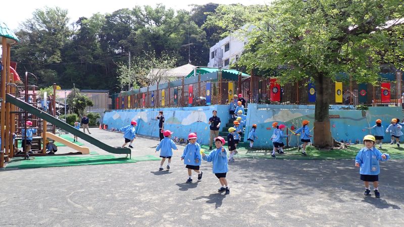 晴天の下、改めて園庭の遊び方の確認を行い、その後はそれぞれ滑り台や小さなお家、ボール投げと子ども達の活気あふれる元気な声が園庭一杯に響き渡ります。