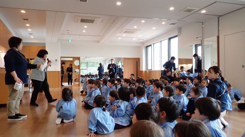 歌や手遊びを行ったり、約束を発表したりします。しっかりと視線を合わせて話に集中することができる年中・年長組。まだまだ自由な可愛い年少組。来年の今頃は、年少組も立派になるのだろうと成長を感じた瞬間でした。