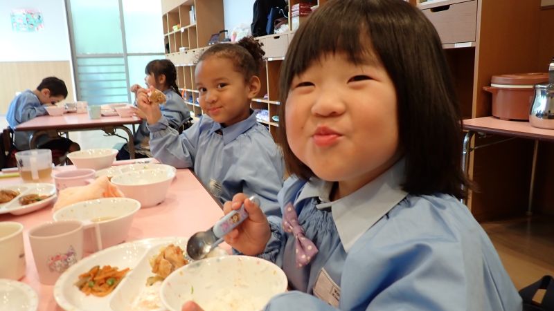 どのクラスもお腹が空いてとてもよく食べていました。初めてのことり組も、「美味しい!」「もっと食べたい」の声が響き渡ります。座ってしっかり食べている、そんな落ち着いた様子に思わず感心しました。
