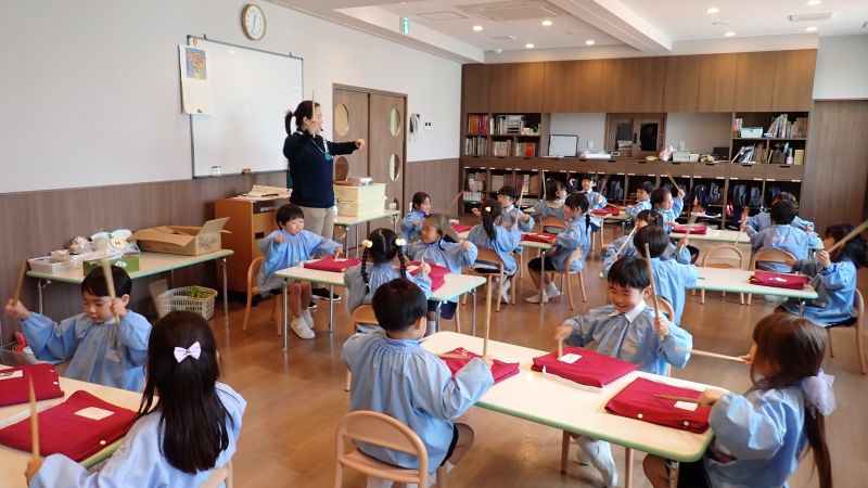 当園では年長だけが行っている小太鼓。憧れていたバチの扱い方を現在学習中。まずは座布団を太鼓に見立てて叩きます。歴代先輩たちの演奏姿、そんな記憶も後押ししてか意欲を掻き立てて、上手に曲に合わせます。